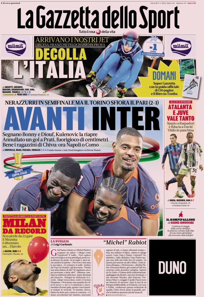 Il ritorno della Coppa Italia è uno dei temi principali delle prime pagine di oggi, giovedì 5 febbraio. In campo ieri sera Inter e Torino, con i nerazzurri che si sono imposti per 2-1. A segno Bonny nel primo tempo e Diouf ad inizio ripresa, poi è arrivata la reazione del Toro con la rete di Kulenovic ma non è bastata per portare il match ai rigori. Al prossimo turno, la squadra di Chivu affronterà la vincente tra Napoli e Como.