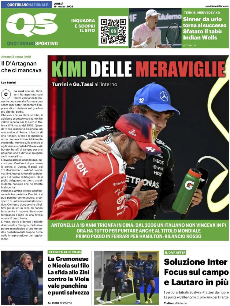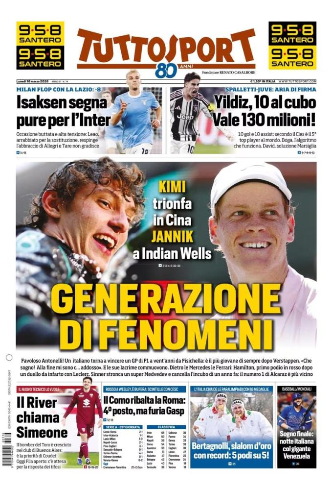 La sconfitta del Milan in casa della Lazio è uno degli argomenti principali sui quotidiani sportivi presenti in edicola quest'oggi, lunedì 16 marzo 2026, e che vi proponiamo in calce. I rossoneri non riescono ad approfittare del mezzo passo falso dell'Inter contro l'Inter e cadono all'Olimpico contro la Lazio di Sarri. Decisivo un gol di Isaksen nel primo tempo. Ora l'Inter è a +8.