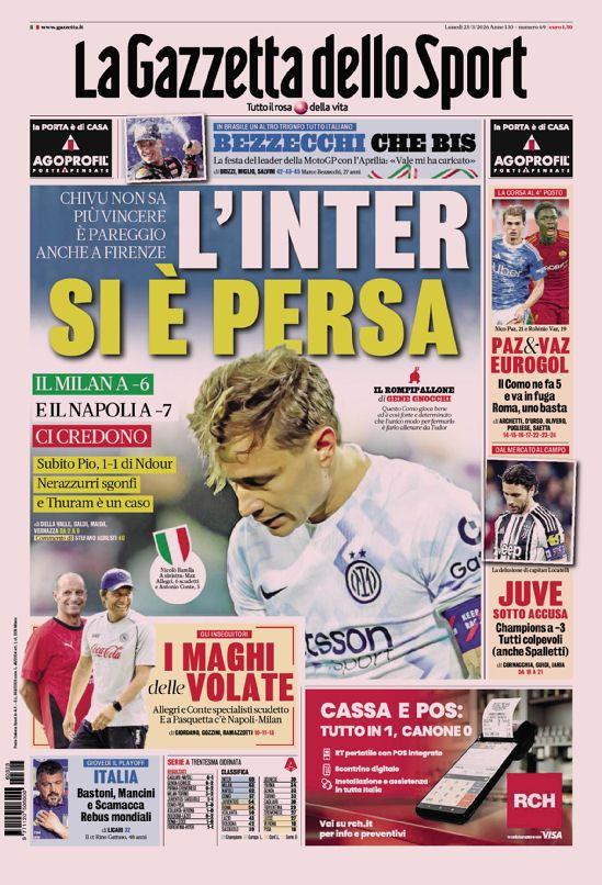 Il momento dell’Inter domina le aperture odierne, tra risultati che non arrivano e una classifica che inizia a farsi più corta alle spalle. Il pareggio di Firenze certifica una fase complicata per i nerazzurri, raggiunti nella ripresa dopo il vantaggio iniziale e ora con un margine ridotto su Milan e Napoli, entrambe tornate pienamente in corsa. La squadra di Christian Chivu paga un calo evidente nella continuità e nelle prestazioni, con segnali di difficoltà che riguardano anche alcuni singoli chiave come Marcus Thuram.