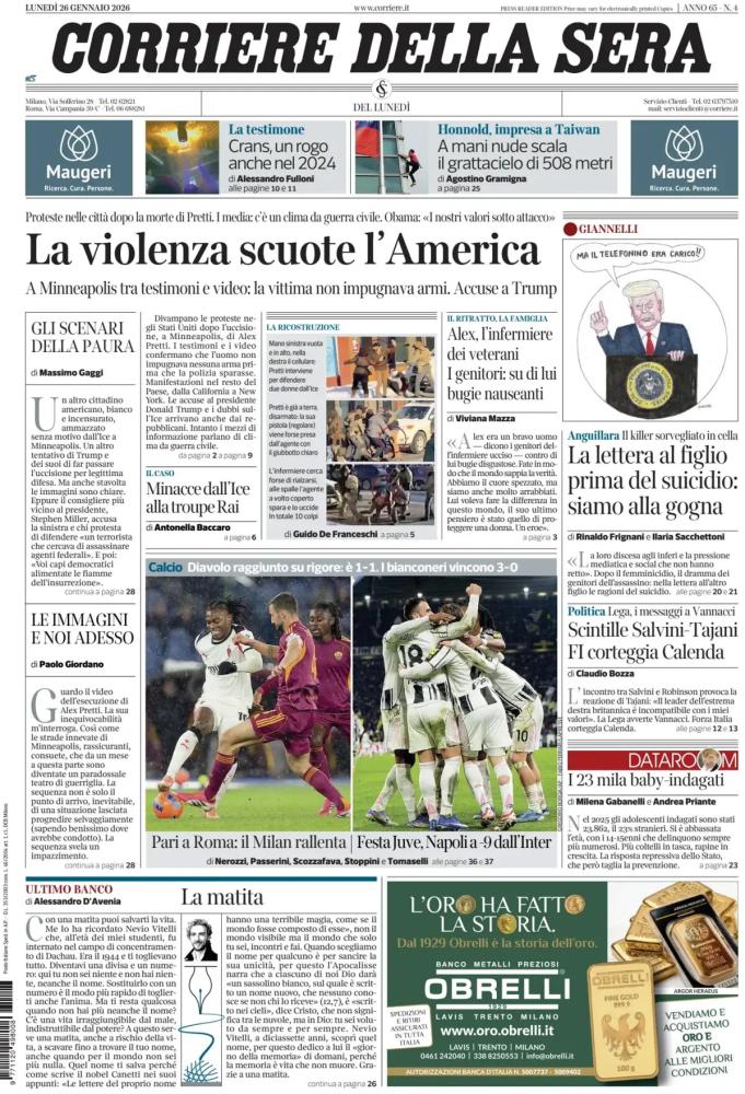 Le prime pagine dei quotidiani italiani e stranieri di oggi, lunedì 26 gennaio