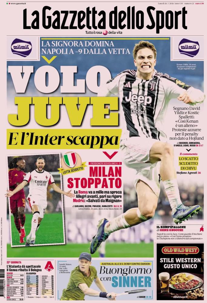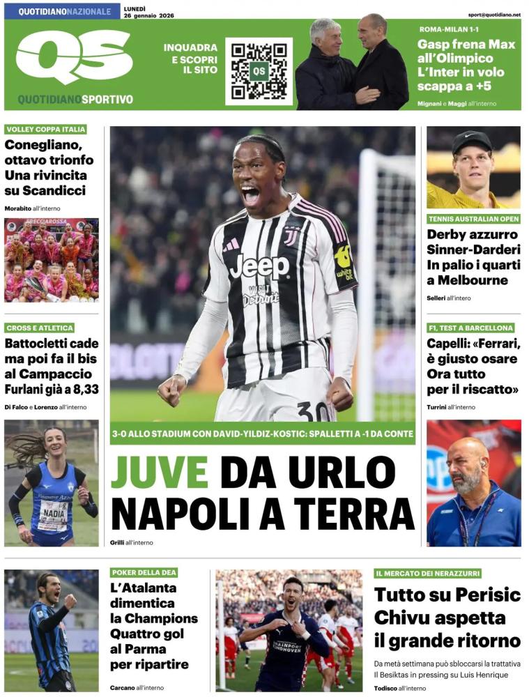 La prima vera fuga dell'Inter è uno degli argomenti principali sugli argomenti dei quotidiani in edicola quest'oggi, lunedì 26 gennaio 2026, e che vi proponiamo in calce. Una domenica positiva per i nerazzurri, vittoriosi 6-2 sul Pisa venerdì, e spettatori ieri in occasione dei due big match Napoli-Juventus e Roma-Milan.