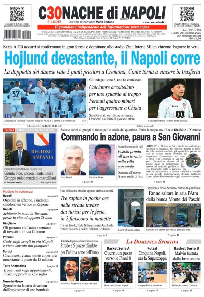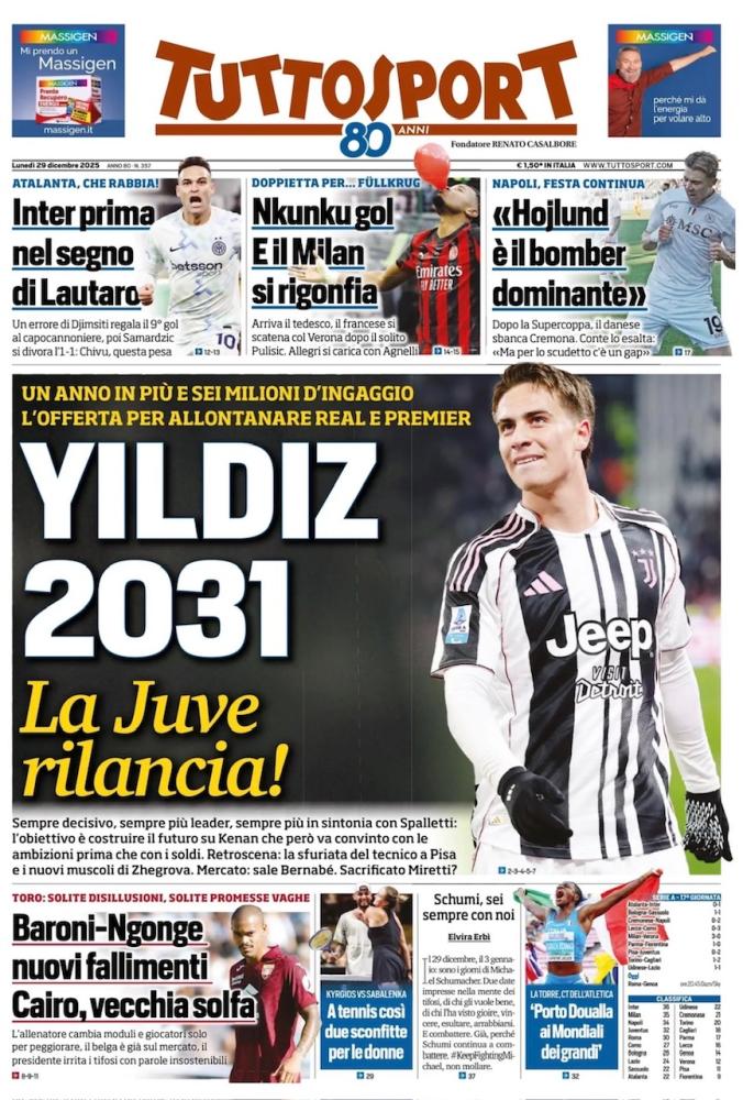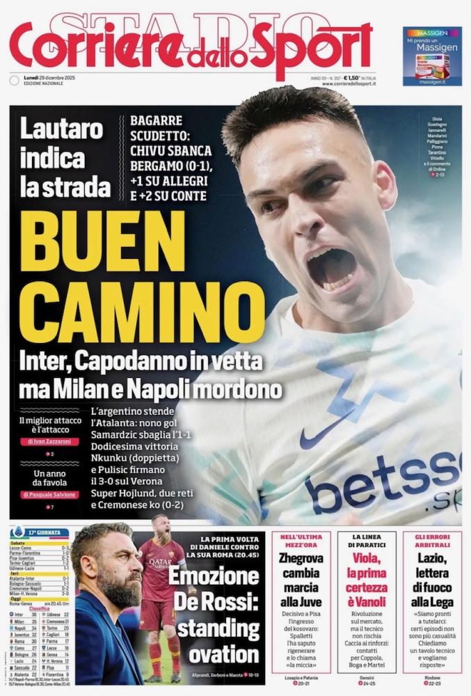 Spicca sulle prime pagine dei quotidiani in edicola oggi, lunedì 29 dicembre, la rinnovata capolista Inter. Il successo di misura strappato ieri sera a Bergamo contro l'Atalanta di Palladino - complice il regalo gratuito di Djimsiti - ha permesso ai meneghini di riappropriarsi della vetta del campionato e ricacciare in fondo il Milan vincente con l'Hellas Verona a San Siro e distante un solo punto. I rossoneri di Max Allegri però esultano perché Nkunku finalmente si è tolto il peso del gol mancante in Serie A dopo la doppietta rifilata agli scaligeri.