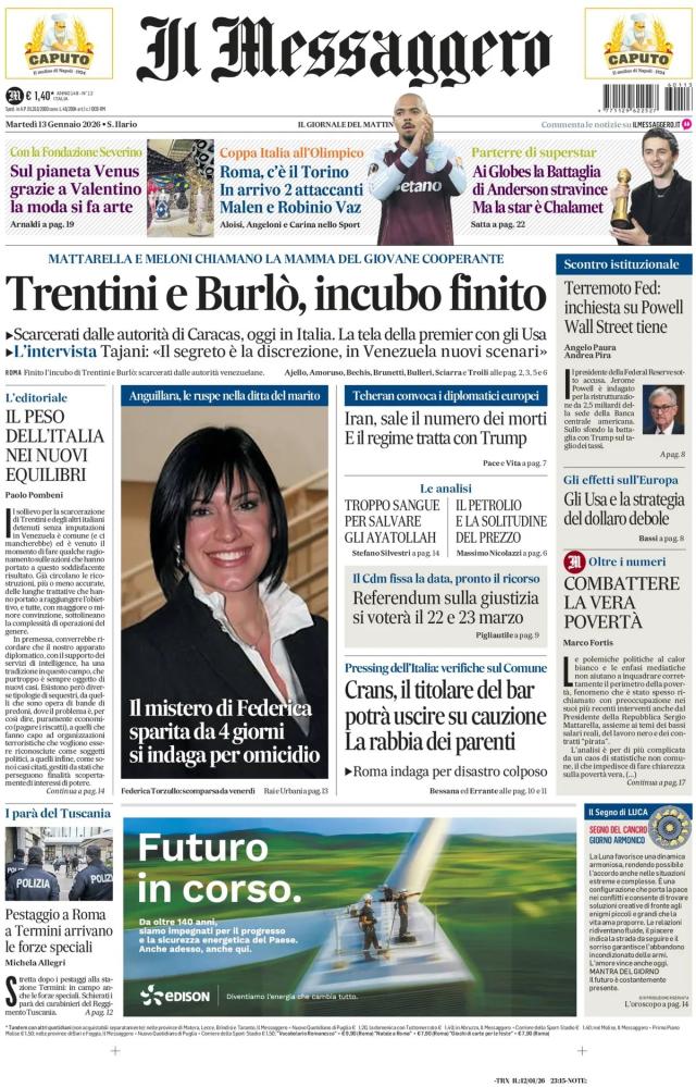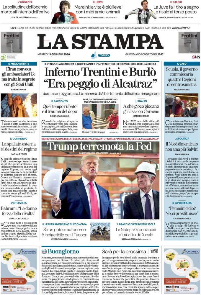 Le prime pagine dei quotidiani italiani e stranieri di oggi, martedì 13 gennaio
