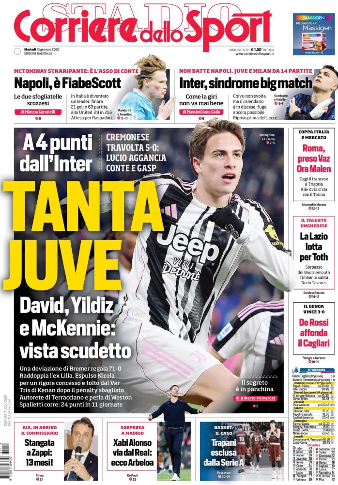 Spicca sulle varie prime pagine dei principali quotidiani sportivi nazionali di oggi, martedì 13 gennaio, la manita della Juventus alla Cremonese in chiusura della ventesima giornata di Serie A: Yildiz ha suonato la carica, sebbene il rigore sbagliato, trovando la rete del riscatto pochi istanti dopo e uscendo dal campo su ovazione del pubblico. Comparsi sul tabellino anche Bremer, Jonathan David e McKennie, oltre allo sfortunato autogol di Terracciano. Così i bianconeri di Spalletti si sono accaparrati il terzo posto in classifica, a -4 dal primo posto attualmente dell'Inter.