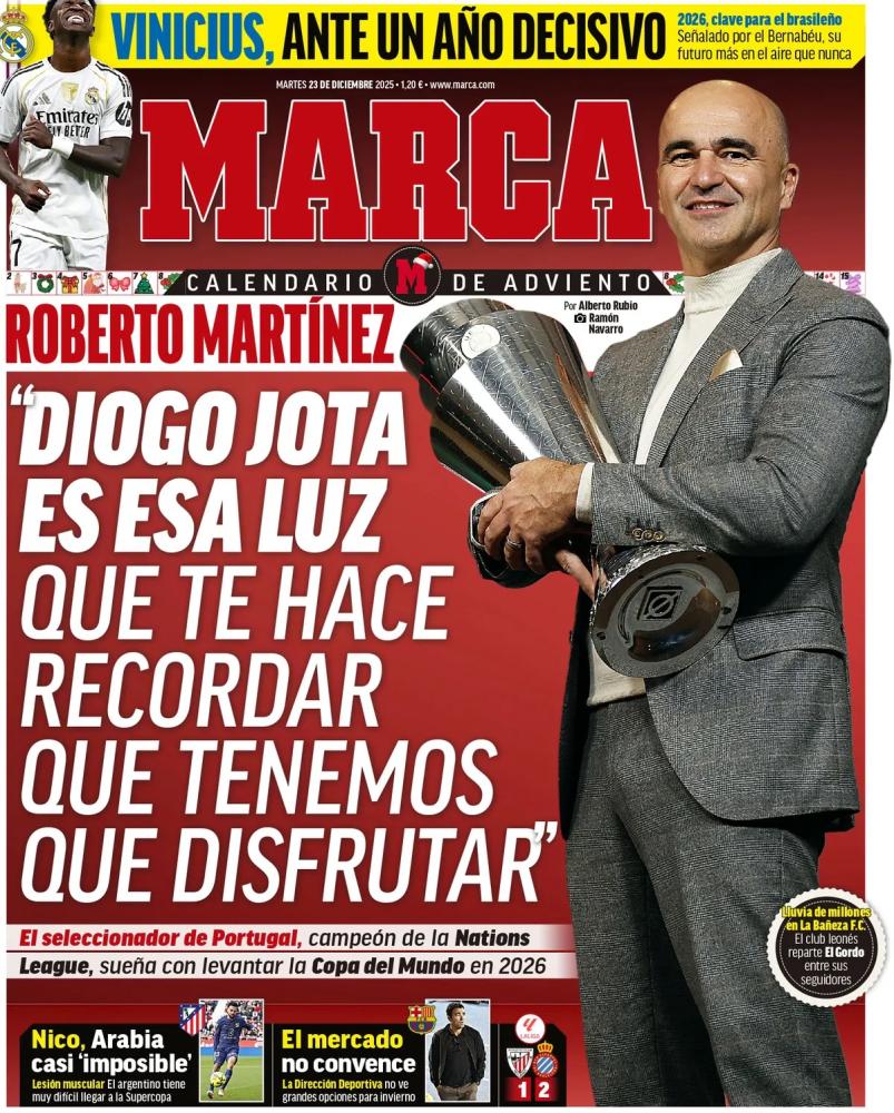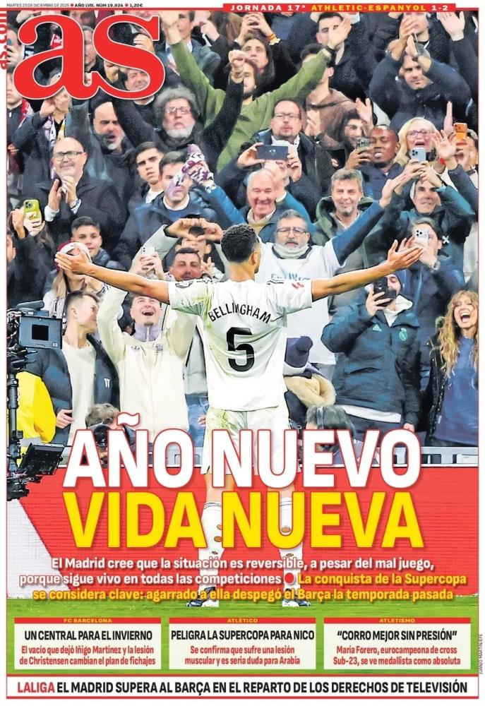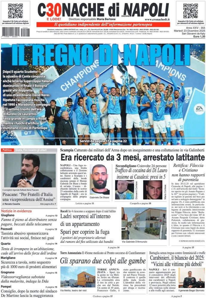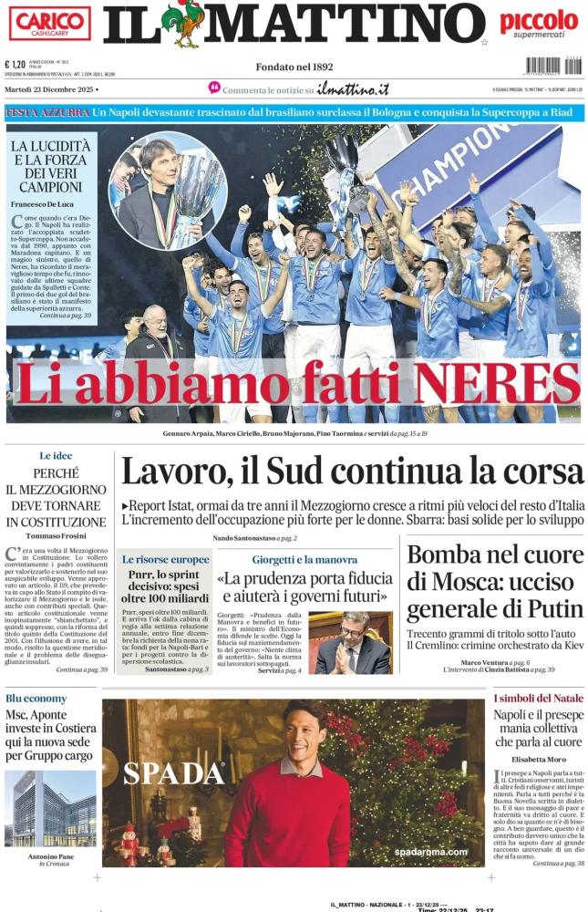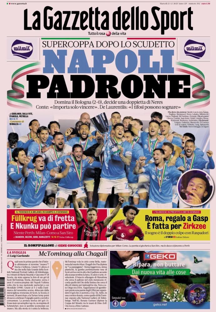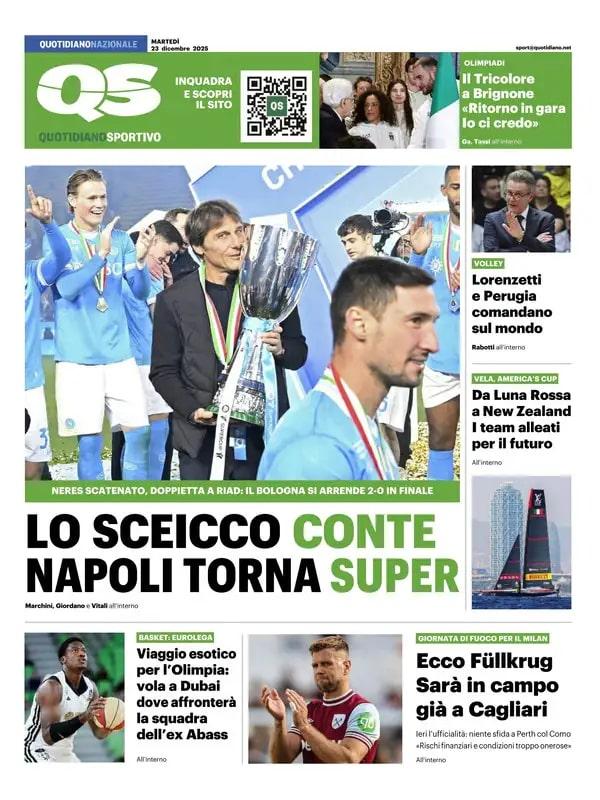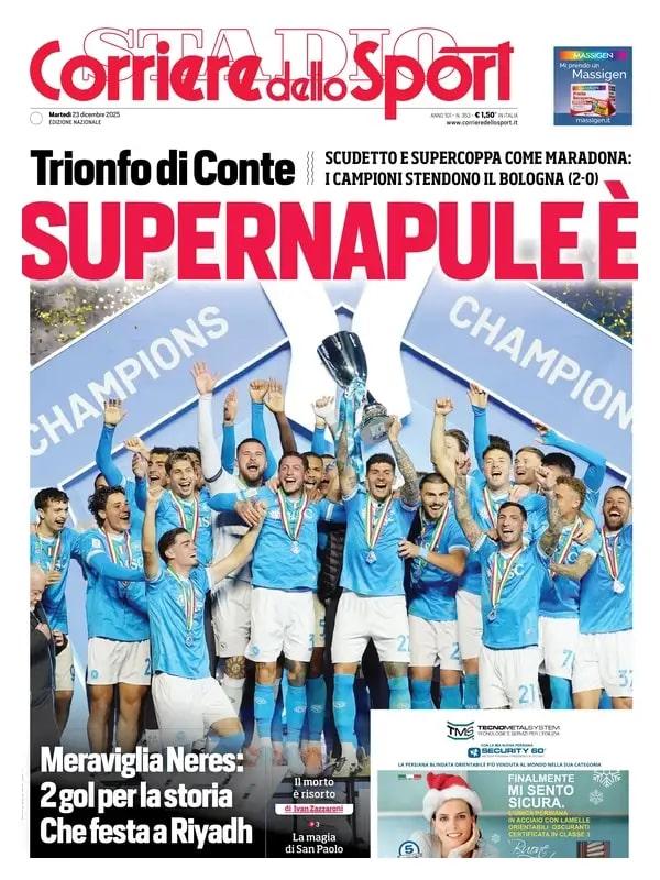 Nella giornata di oggi, martedì 23 dicembre, il Napoli viene celebrato su tutte le prime pagine dei quotidiani nazionali sportivi in edicola. La banda di Antonio Conte a distanza di sette mesi dal quarto Scudetto della storia del club ha saputo conquistare la Supercoppa, grazie ad una roboante doppietta di David Neres, letteralmente esploso in azzurro questa stagione. Il Bologna, che aveva eliminato l'Inter ai calci di rigore in semifinale, viene sconfitto sul più bello 2-0 e deve tornare a casa a mani vuote.