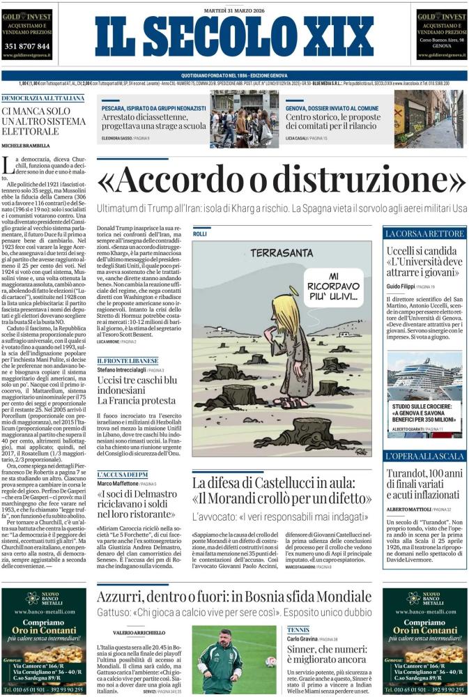 Il giorno della verità è arrivato. La sfida in programma questa a Zenica tra Bosnia-Erzegovina e l'Italia di Rino Gattuso è di certo l'argomento di punta del giorno presente sui quotidiani nazionali e locali in edicola quest'oggi, martedì 31 marzo 2026. Da dodici anni la Nazionale azzurra aspetta di tornare a disputare un Mondiale di calcio, dopo le due eliminazioni ai playoff contro Macedonia del Nord e Svezia. Stavolta sul percorso pre-competizione iridata dovrà fronteggiare vecchie e nuove conoscenze militanti in Serie A, da Kolasinac a Muharemovic e Dzeko, ma non solo.