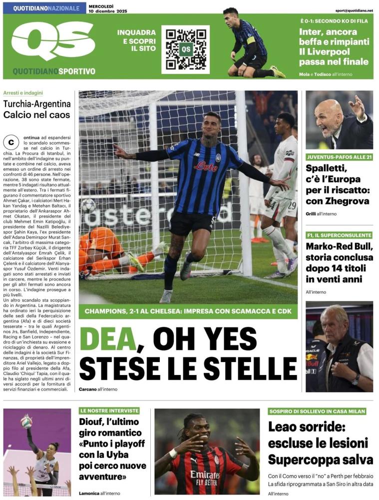 La caduta dell'Inter contro il Liverpool per un rigore contestato ampiamente dal club nerazzurro e dalla stampa italiana, il successo ritrovato dall'Atalanta in Champions League e contro il Chelsea alla New Balance Arena sono tra gli argomenti principali dei quotidiani in edicola quest'oggi, mercoledì 10 dicembre. Finisce 1-0 a San Siro tra nerazzurri e Reds, a segno Szoboszlai dal dischetto al minuto 88 dopo trattenuta ravvisata dall'arbitro di Bastoni su Wirtz in area, su revisione al monitor e richiamo del VAR. La Dea stupisce e supera 2-1 i Blues di Enzo Maresca nel segno di Scamacca e De Ketelaere invece.