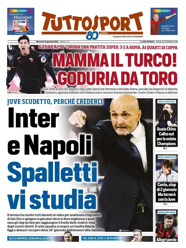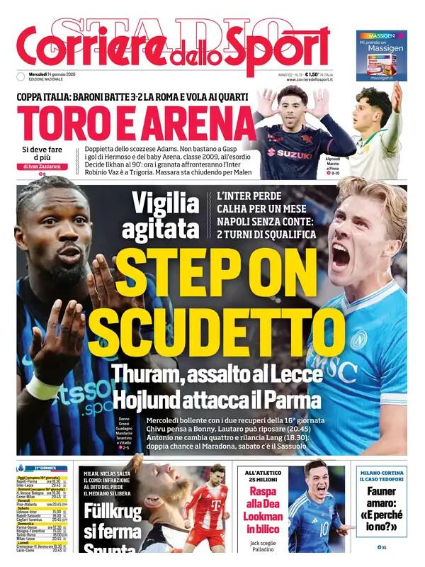 La Serie A che torna con i recuperi della 16^ giornata è uno dei temi principali delle prime pagine di oggi, mercoledì 14 gennaio. Inter e Napoli, reduci dallo scoppiettante scontro diretto, scendono entrambe in campo: alle 18.30 i partenopei in casa contro il Parma, mentre alle 20.45 i nerazzurri a San Siro contro il Lecce. Domani si completa il quadro con Verona-Bologna e Como-Milan.