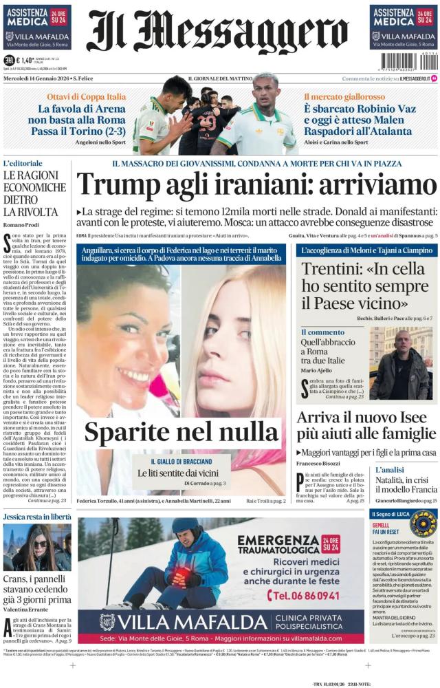 Le prime pagine dei quotidiani italiani e stranieri di oggi, mercoledì 14 gennaio