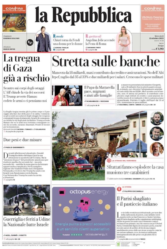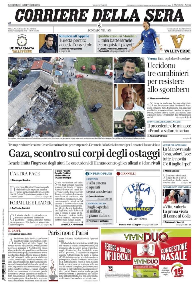 Le prime pagine dei quotidiani italiani e stranieri di oggi, mercoledì 15 ottobre