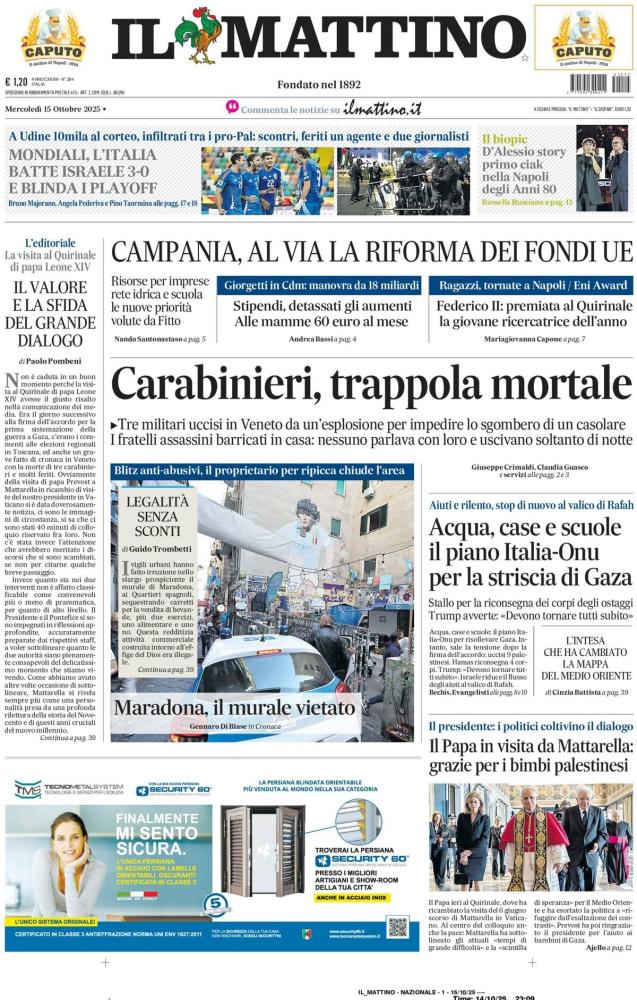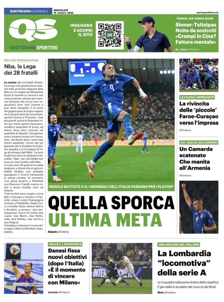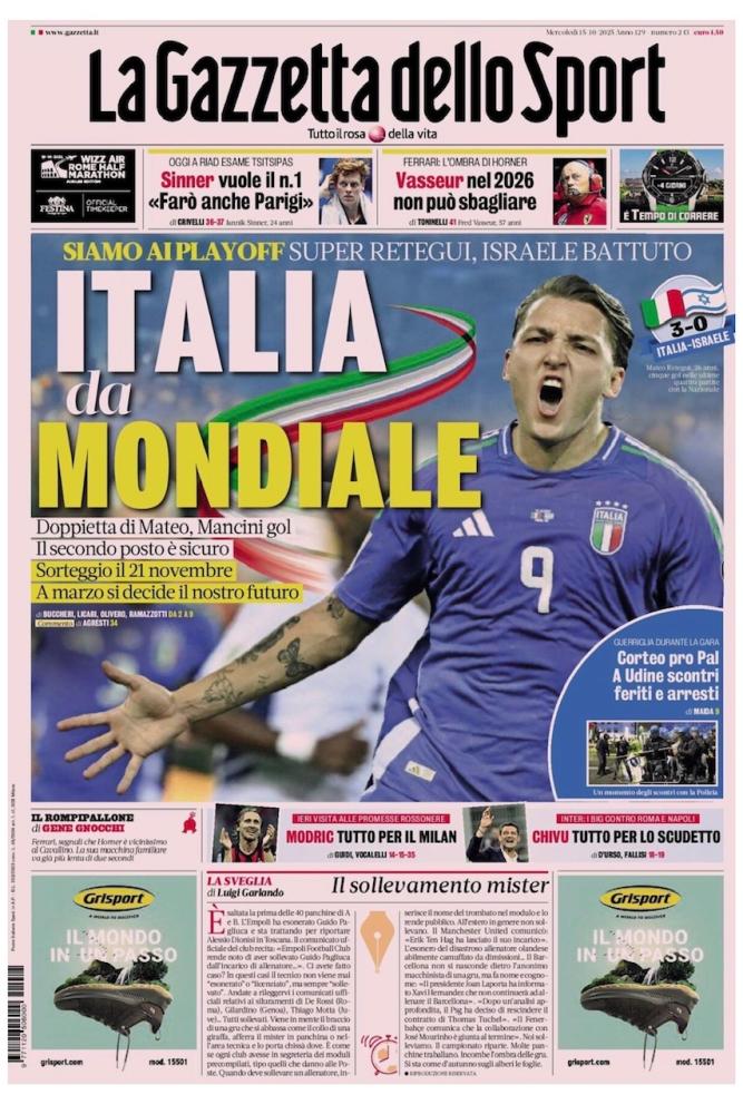 Sono ovviamente dedicati alla Nazionale i titoli di apertura dei principali giornali sportivi in edicola oggi, mercoledì 15 ottobre. L'Italia di Gattuso batte 3-0 Israele nella discussa gara giocata ieri sera al Bluenergy Stadium di Udine e si guadagna un posto nel playoff che vale un posto per il Mondiale 2026: l'uomo copertina è Mateo Retegui, autore della doppietta che indirizza il match con un gol per tempo (perfetto calcio di rigore nel promo tempo, eurogol con destro a giro nel secondo) prima del definitivo 3-0 del romanista Gianluca Mancini.