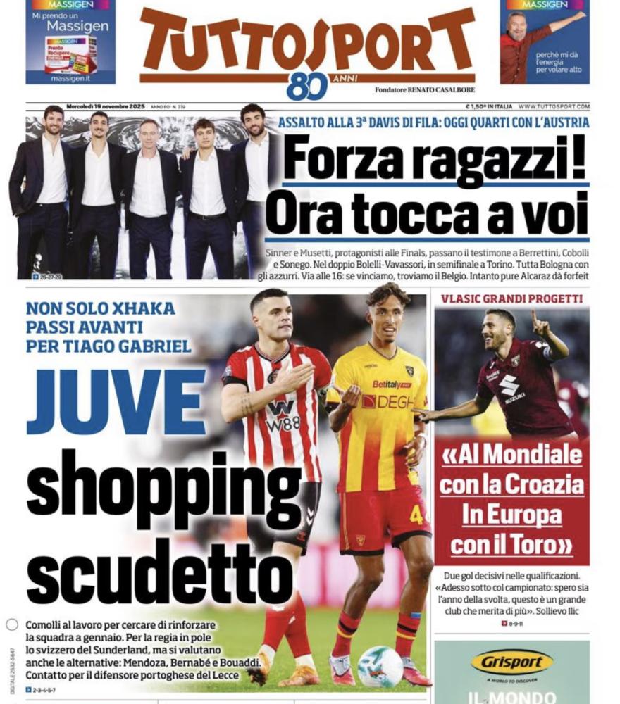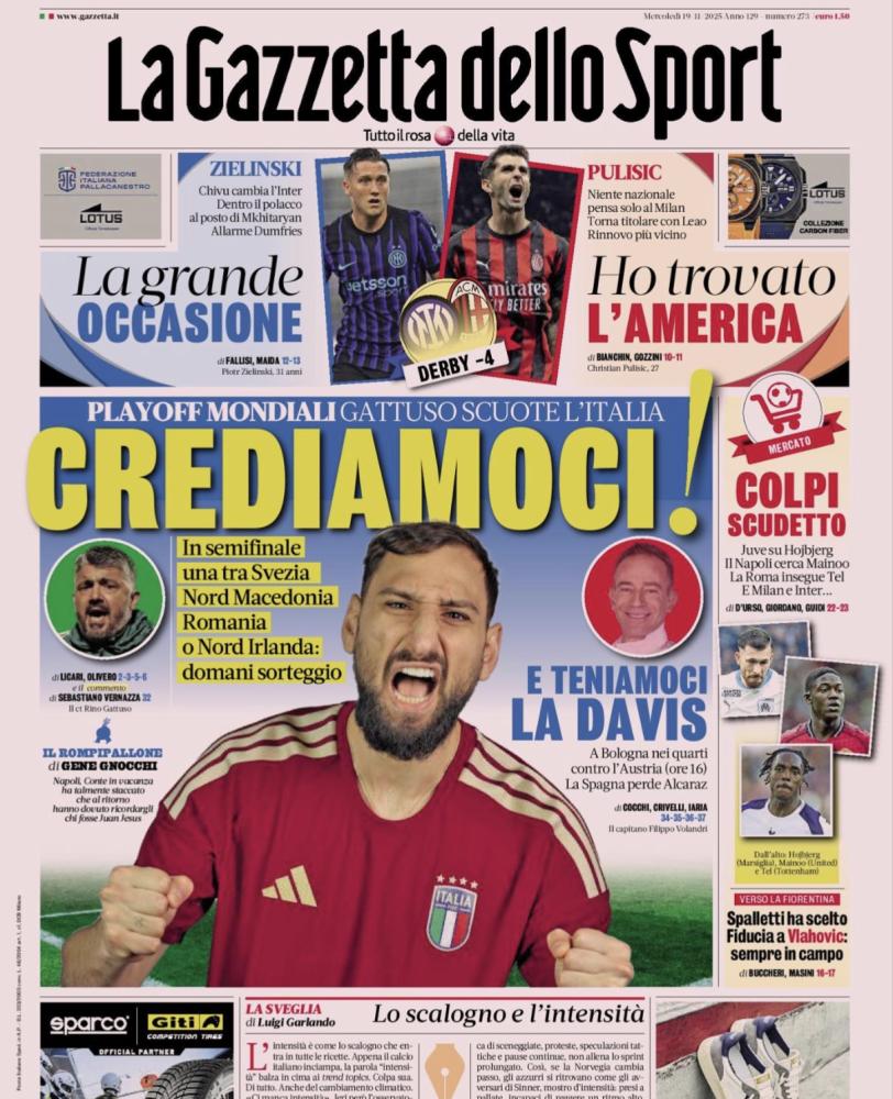 La Nazionale che presto conoscerà il suo destino in ottica playoff rappresenta uno dei temi principali delle prime pagine di oggi, mercoledì 19 novembre. Definito il quadro degli spareggi per accedere ai Mondiali del 2026: agli azzurri in semifinale toccherà una tra Svezia, Macedonia del Nord, Romania e Irlanda del Nord. Domani il sorteggio.