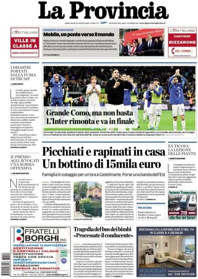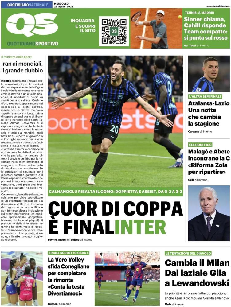 La Coppa Italia trova ampio spazio sulle prime pagine dei quotidiani in edicola quest'oggi, mercoledì 22 aprile 2026, e che vi proponiamo in calce. La grande rimonta dell'Inter nella prima semifinale di Coppa contro il Como è l'argomento principale sui quotidiani. Il Como si illude un'altra volta andando avanti di due gol ma nella ripresa viene rimontato dalla doppietta di Calhanoglu e dal gol di Sucic: 3-2 a San Siro, in finale ci va l'Inter.