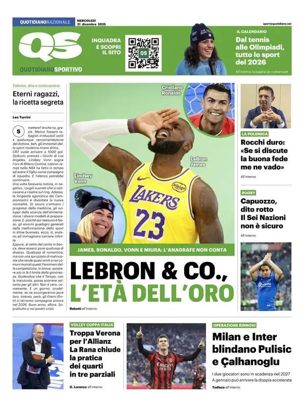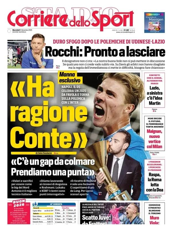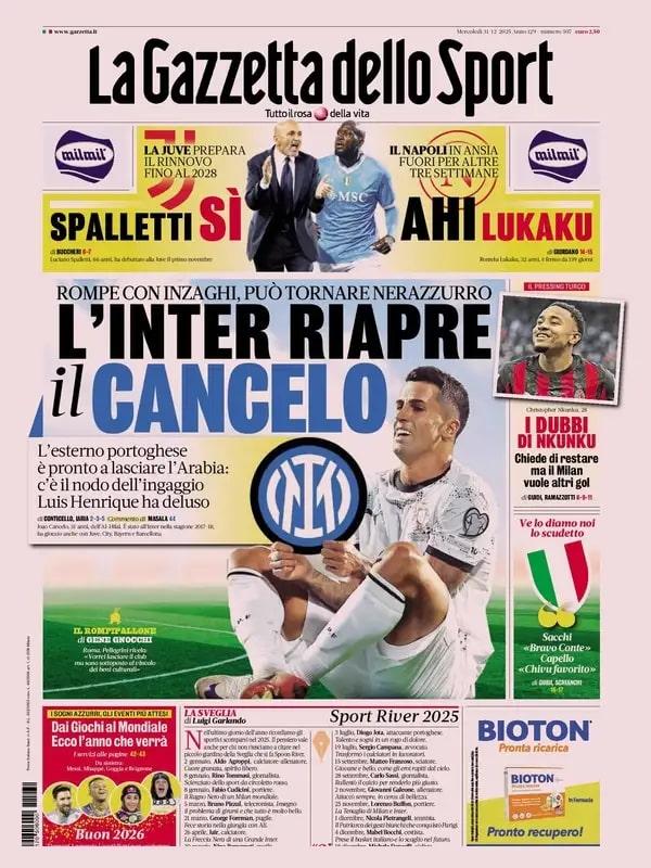 Il mercato inverale è uno dei temi principali delle prime pagine di oggi, mercoledì 31 dicembre. In primo piano Inter e Juventus: i nerazzurri potrebbero riabbracciare Cancelo (in rotta con Inzaghi e pronto a lasciare l'Arabia), mentre i bianconero potrebbero accogliere proprio da Milano Frattesi e pensano a Mandas della Lazio come obiettivo per la porta.