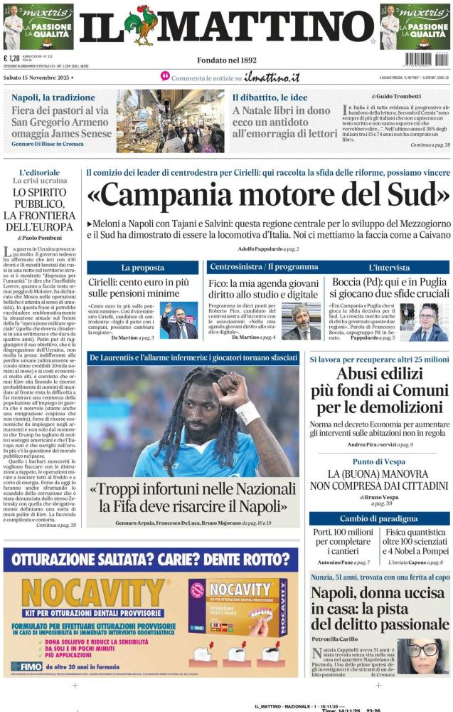 La Nazionale con le parole di Gattuso ("State vicino all'Italia") è uno degli argomenti principali sulle prime pagine dei quotidiani sportivi e non in edicola quest'oggi, sabato 15 novembre 2025, e che vi proponiamo in calce.
