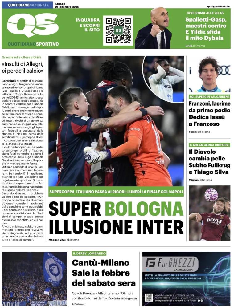 La sconfitta dell'Inter ai calci di rigore nella semifinale di Supercoppa contro il Bologna tra gli argomenti principali sulle prime pagine dei quotidiani in edicola quest'oggi, sabato 20 dicembre 2025, e che vi proponiamo in calce. Fuori le milanesi, la finale di Supercoppa sarà tra Napoli e Bologna.