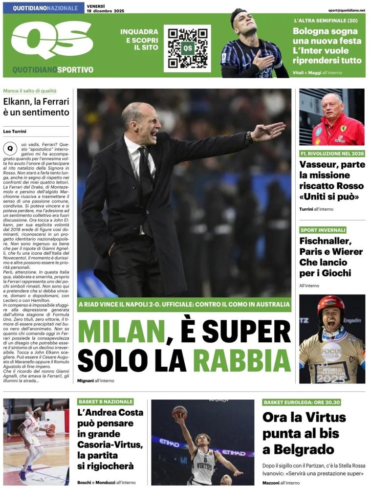 Il principale tema di oggi, venerdì 19 dicembre, si focalizza sul primo risultato della Final Four di Supercoppa Italiana: il Napoli di Antonio Conte ha valicato il Milan (2-0) al King Saud University Stadium di Riad, con David Neres e Hojlund sugli scudi. Questa sera invece tocca a Bologna-Inter sfidarsi in uno scontro diretto che decreterà il secondo finalista della competizione e soprattutto la chance unica di giocarsi il primo trofeo stagionale.