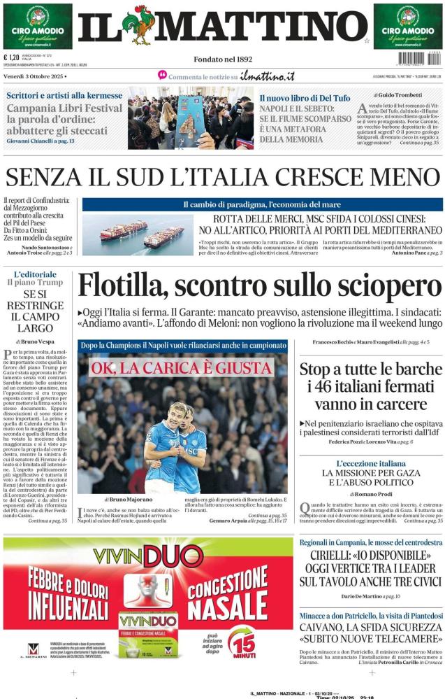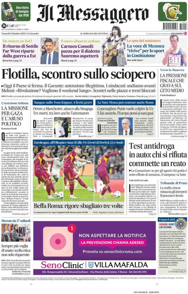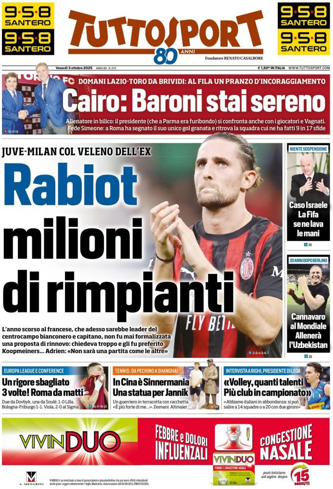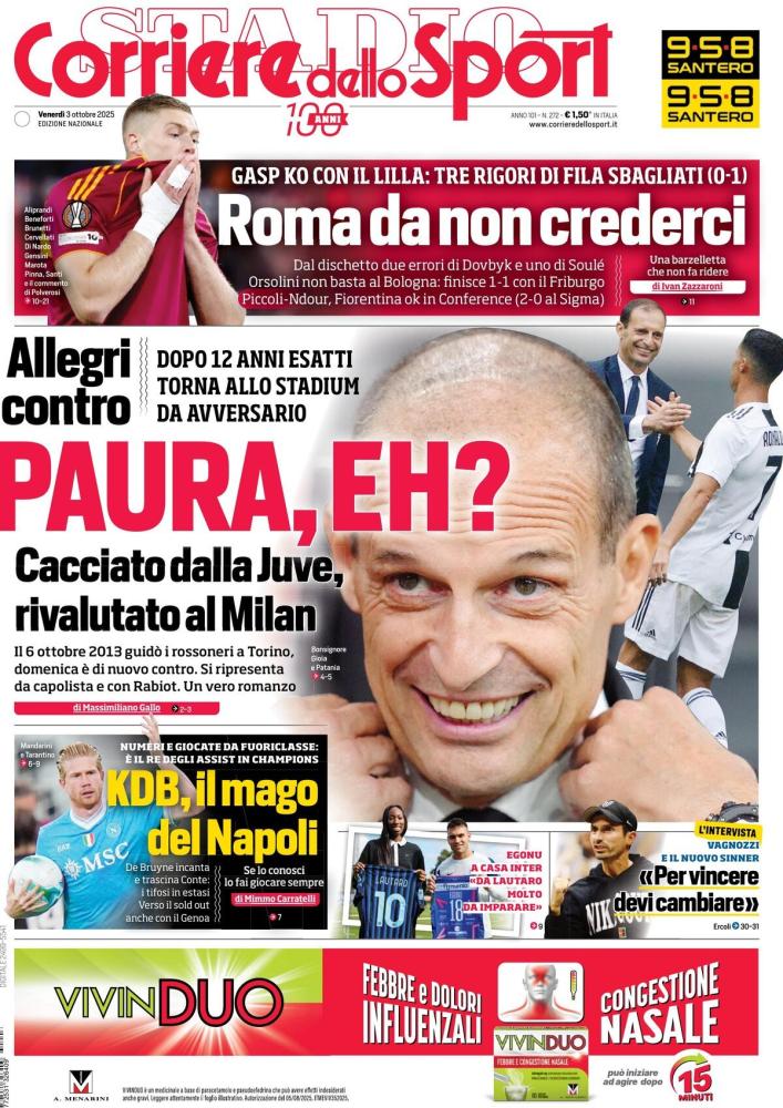 C'è tanto calcio, come da abitudine, nelle prime pagine dei principali giornali sportivi italiani in edicola oggi, venerdì 3 ottobre. I quotidiani si concentrano sui risultati di campo partendo dai risultati di ieri tra Europa e Conference League: la Roma esce sconfitta di misura dall'Olimpico per mano del Lille, mentre a Dall'Ara il Bologna non va oltre l'1-1 contro il Friburgo. Nella seconda giornata di Conference League, invece, la Fiorentina batte 2-0 i cechi del Sigma Olomuc con un gol per tempo: Piccoli apre le danze, poi Ndour chiude i giochi nel recupero.