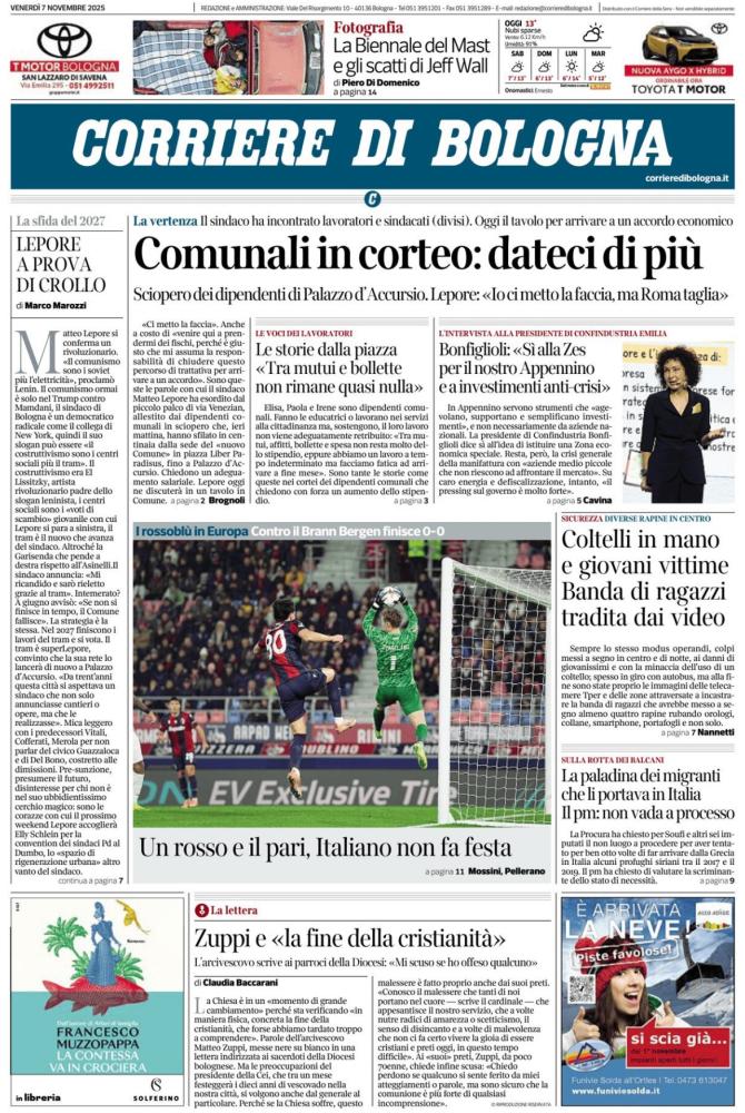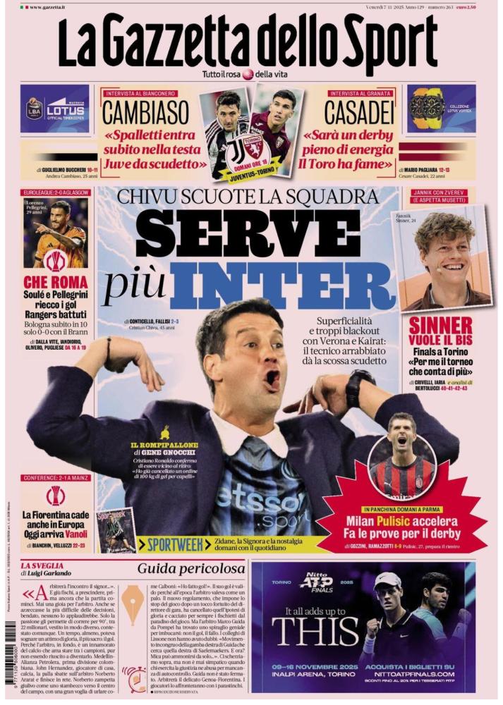 Ampio spazio al campo, alle coppe europee e alla lotta scudetto nelle prime pagine dei principali quotidiani sportivi in edicola oggi, venerdì 7 novembre 2025. I titoli di apertura si concentrano sulle big del nostro campionato, pronte a scendere in campo nel weekend che anticipa la terza sosta per le Nazionali: nella zona d'alta classifica aprono le danze Milan e Juventus, attese domani rispettivamente dalla trasferta di Parma e dal derby contro il Torino. Il Napoli capolista farà invece visita al Bologna domenica pomeriggio, mentre la Roma alle 18 ospiterà l'Udinese. Chiude il turno il big match di San Siro tra Inter e Lazio.