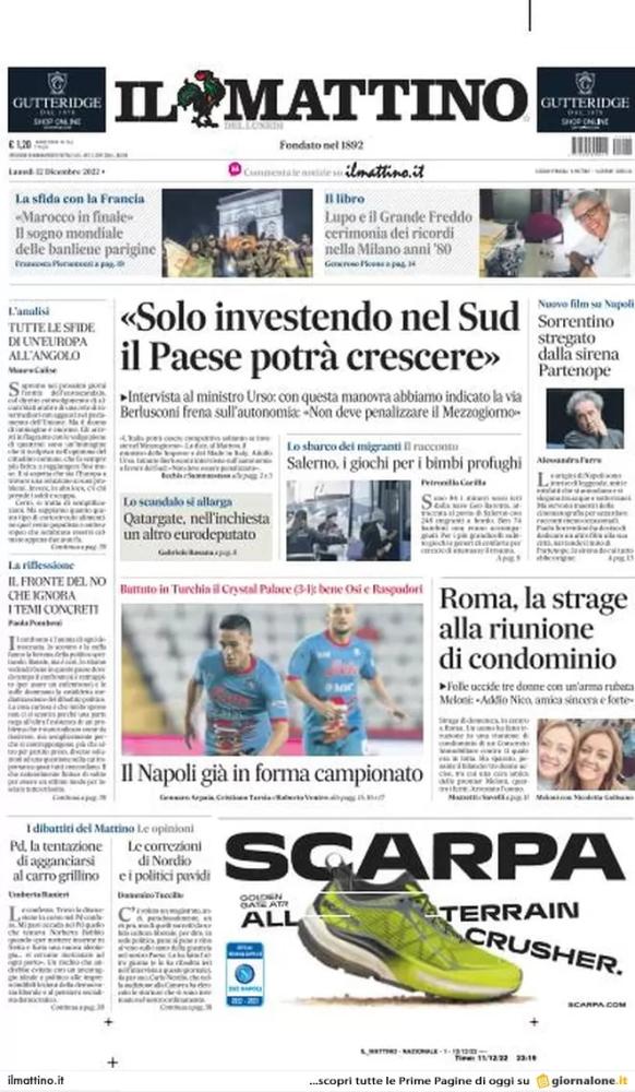 I quotidiani sportivi, e non, questa mattina in edicola si occupano di svariati temi, tra cui la favola Marocco al Mondiale, l’amichevole vinta ieri dal Napoli per 3-1 contro il Crystal Palace e le dinamiche di mercato relative principalmente alla Juventus. Di seguito le principali aperture dei quotidiani italiani e stranieri di oggi, lunedì 12 dicembre 2022.