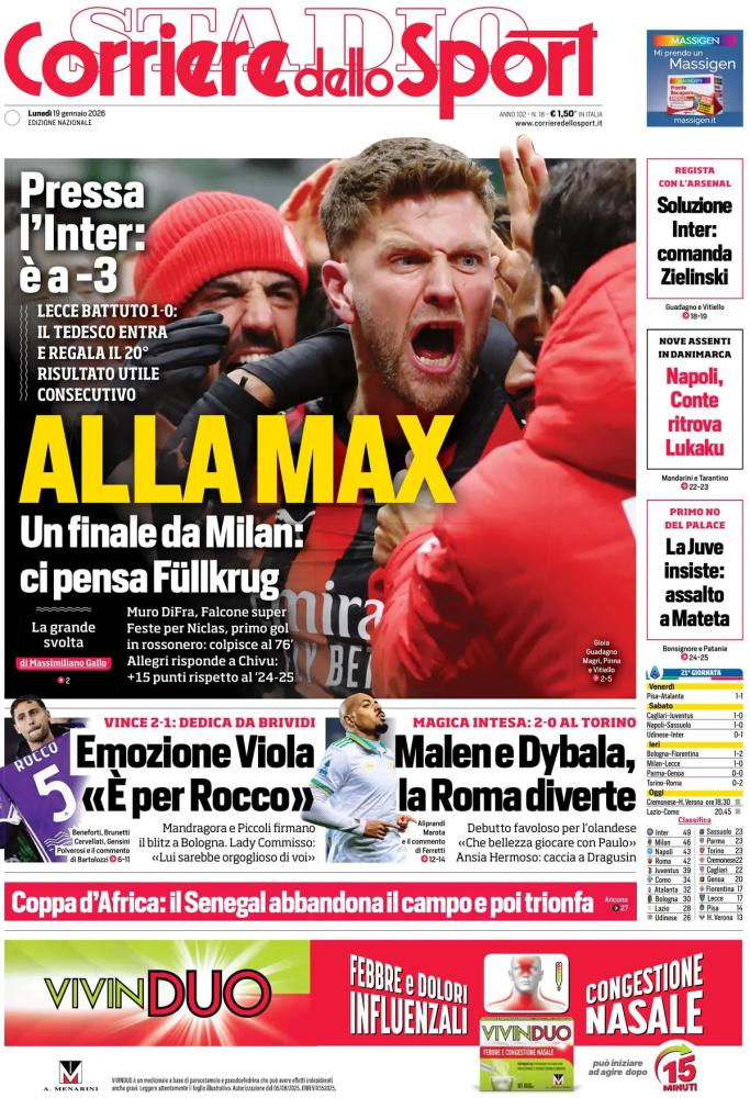 Sulle prime pagine dei principali quotidiani sportivi italiani spicca la vittoria del Milan, che nel posticipo della ventunesima giornata si è imposto per 1-0 sul Lecce: decisivo il gol di Fullkrug, che ha indirizzato la gara disputata a San Siro. In primo piano anche il successo della Roma, passata con un ottimo 0-2 in casa del Torino. I giallorossi sono stati guidati dalla rete del nuovo arrivato Malen ma pure dal gol messo a segno da Dybala.