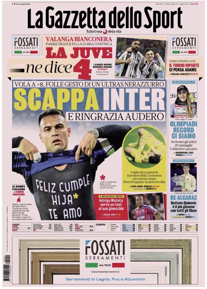 Sulle prime pagine dei quotidiani sportivi italiani spicca il grave gesto di violenza maturato allo Zini, dove Emil Audero è stato colpito da un petardo durante Cremonese-Inter. Un fatto grave, che ha comportato la sospensione del match per diversi minuti e che potrebbe portare ad una multa e alla chiusura della curva per i nerazzurri.