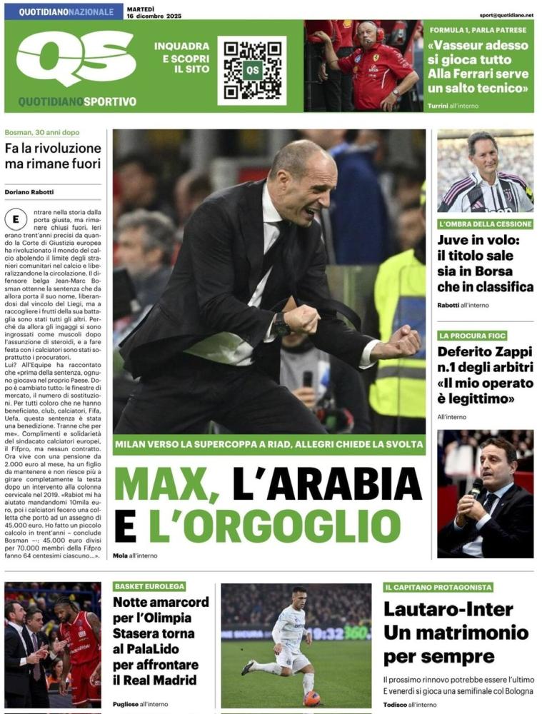 Sulle prime pagine dei principali quotidiani sportivi italiani spicca il fatto che questa settimana è quella della Supercoppa. Giovedì andrà in scena la prima semifinale a Riad tra Napoli e Milan, e venerdì la seconda tra Bologna e Inter. Ieri sera intanto la Roma, grazie alla vittoria per 1-0 sul Como, è rientrata nella corsa Scudetto, piazzandosi al quarto posto a -3 dall'Inter capolista.