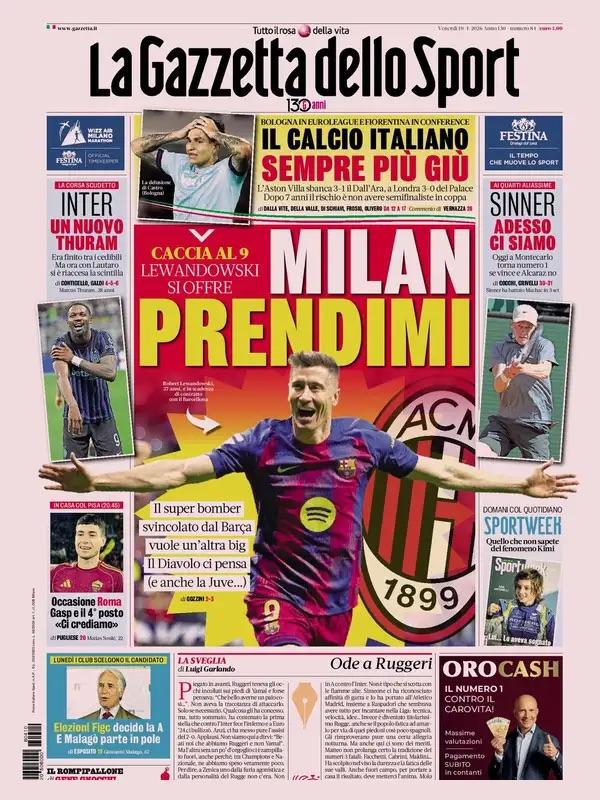"Milan, prendimi. Lewandowski si offre". La Gazzetta dello Sport in prima pagina