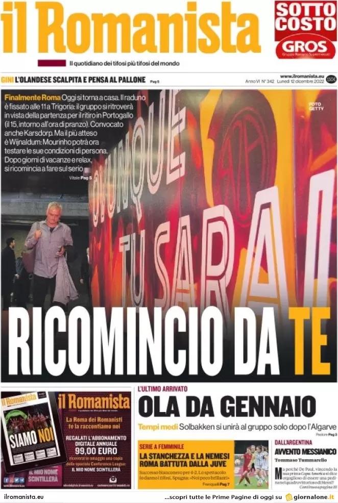 “Ricomincio da te” titola in prima pagina Il Romanista. Oggi il raduno della Roma a Trigoria fissato alle 11: il gruppo si ritroverà in vista della partenza per il ritiro in Portogallo (il 15 intorno all’ora di pranzo). Convocato anche Karsdorp.