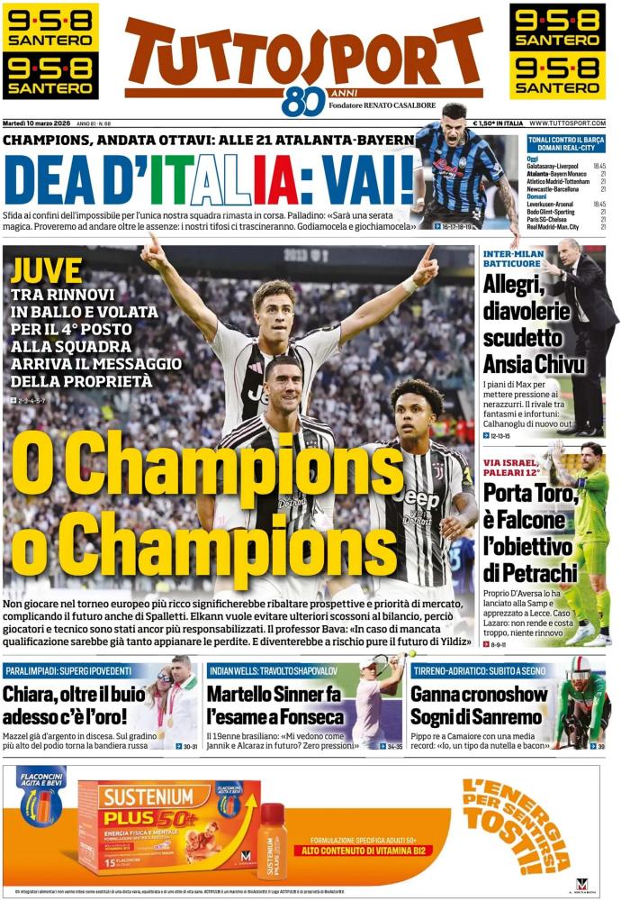 "O Champions". Titola così in prima pagina il quotidiano Tuttosport, che si sofferma sulla Juventus e sugli obiettivi da conquistare da qui al termine della stagione. Uno di questi passa chiaramente dal campionato, dove la Juve punta a chiudere tra le prime quattro per andare in Champions League. Un distanza di appena un punto dal quarto posto, occupato dal Como subito seguito dalla Roma. Tra le priorità, anche i rinnovi di contratto di alcuni giocatori come Vlahovic.