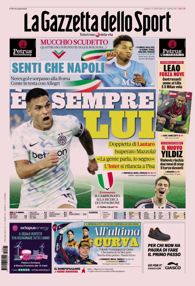 I quotidiani tuttavia si concentrano anche sulla Juventus e su Kenan Yildiz, autentica risorsa della formazione di Luciano Spalletti. In primo piano infine il posticipo della tredicesima giornata di Serie A, che questa sera metterà di fronte Bologna e Cremonese nella sfida in programma al Dall'Ara. Un successo, permetterebbe ai felsinei di volare a quota 27 insieme a Roma e Inter.