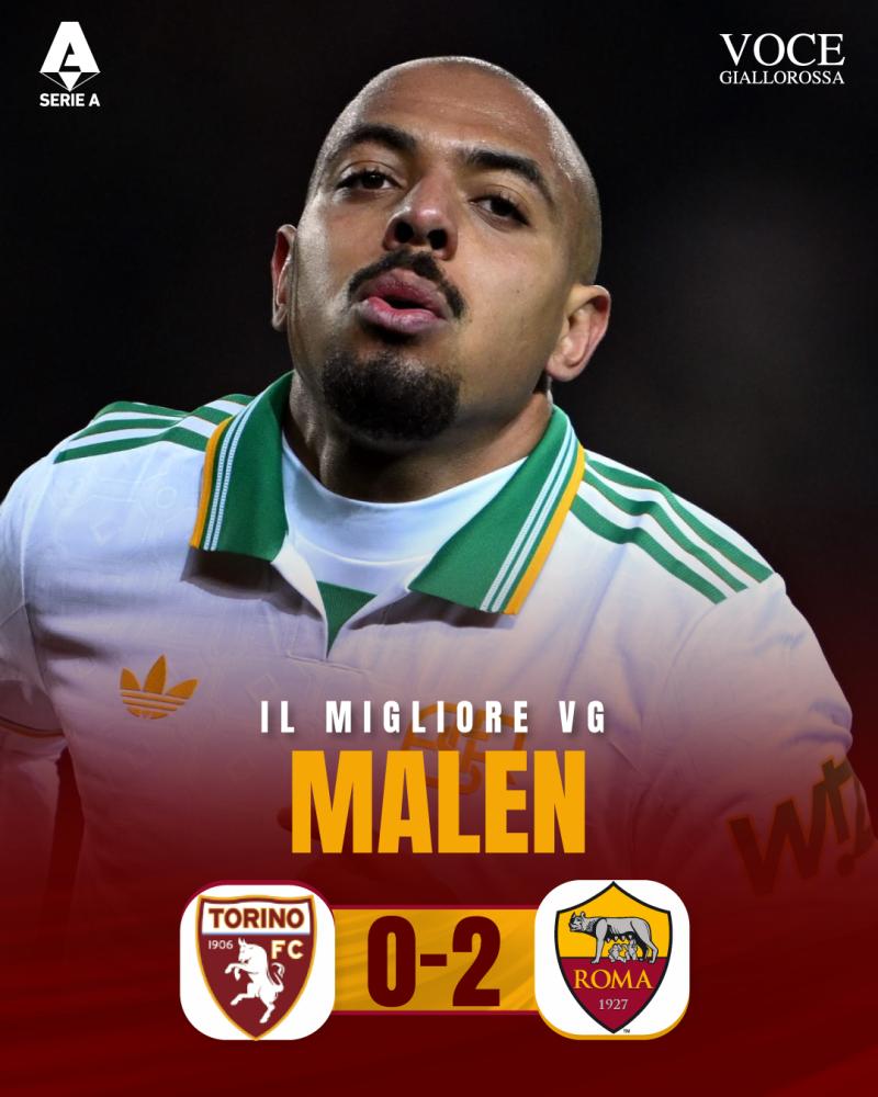La Roma vince in trasferta contro il Torino, allungando in classifica sulla Juventus nella corsa al quarto posto. I giallorossi si sono imposti per 2-0, anche grazie al gol al debutto di Malen. Proprio l'olandese è stato nominato #IlMiglioreVG dai nostri lettori attraverso le votazioni avvenute sui canali social di Vocegiallorossa.it.