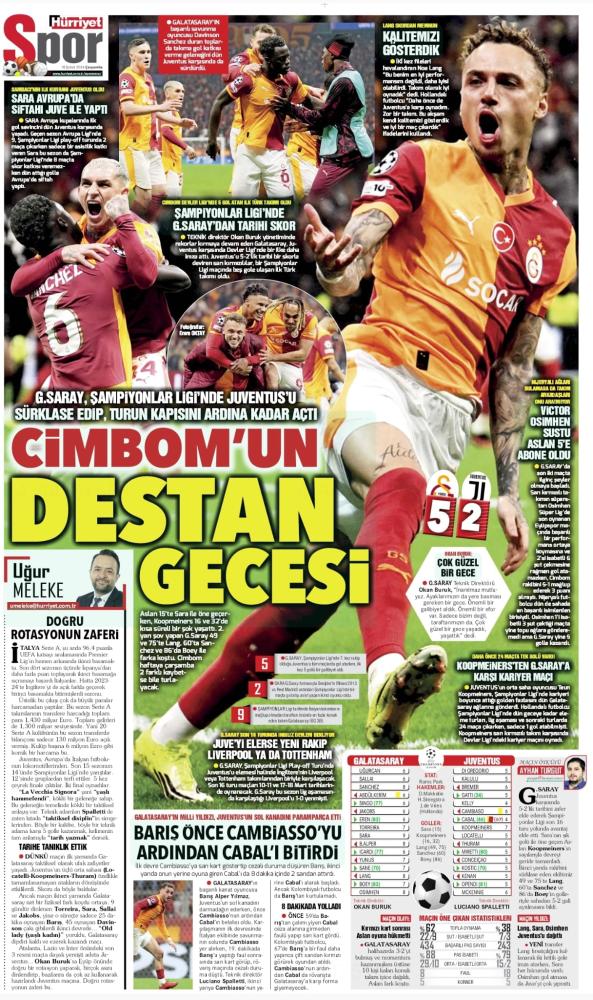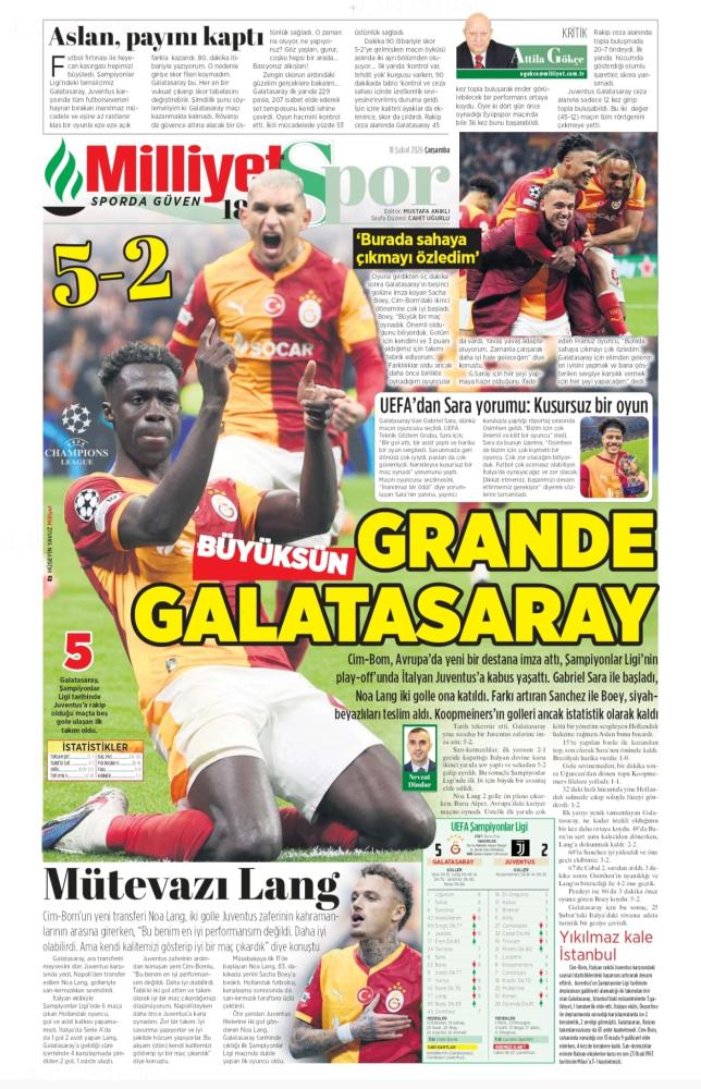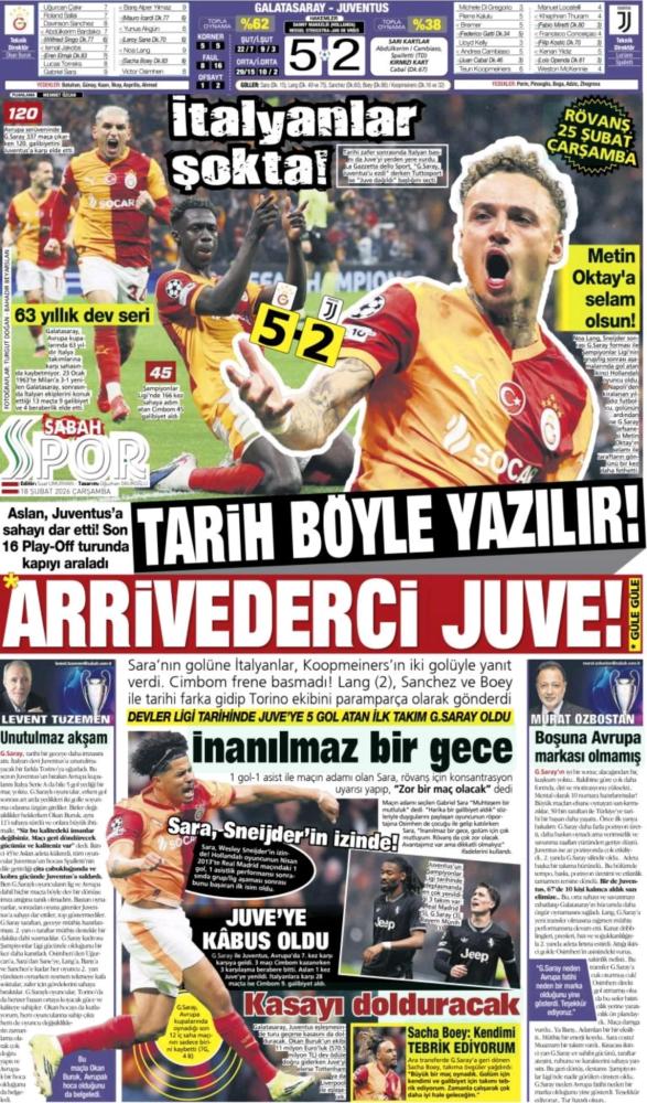 Il quotidiano Milliyet Spor oggi in prima pagina titola in italiano: "Grande Galatasaray". Poi si legge: "Il Galatasaray ha scritto una nuova epopea in Europa, regalando alla Juventus un incubo nei play-off di Champions League. Gabriel Sara ha aperto il match, seguito da Noa Lang con una doppietta. Sanchez e Boey hanno incrementato il vantaggio, sottomettendo i bianconeri. I gol di Koopmeiners sono rimasti solo una statistica".