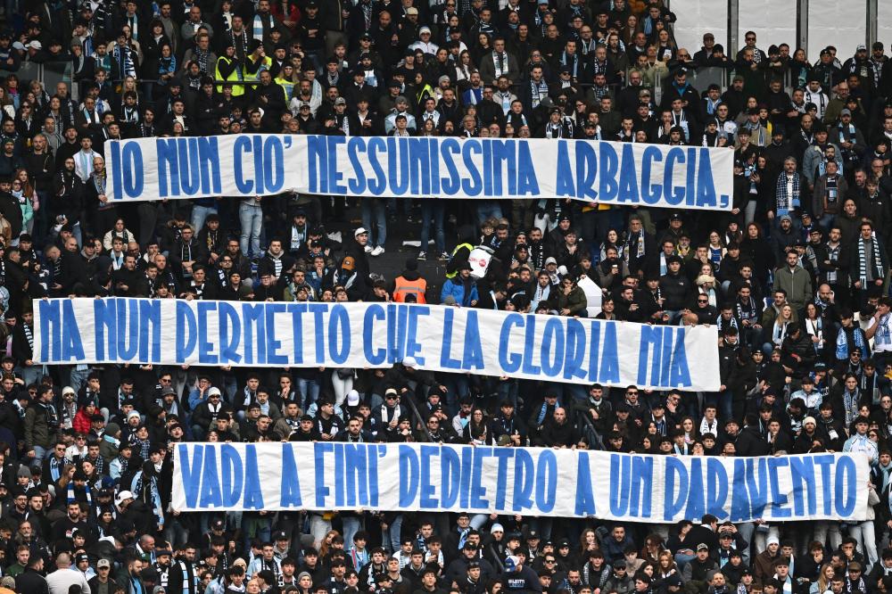 Come si può notare dalle immagini nel corso del match sono stati srotolati diversi striscioni nel cuore pulsante del tifo biancoceleste in cui viene citato “Er pavone” di Trilussa: "Io non ciò nessunissima arbaggia, ma nun permetto che la gloria mia vada a finì dedietro a un paravento".