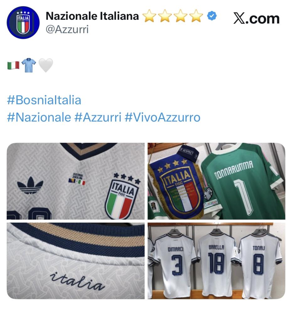 Gli account social della Nazionale Italiana intanto hanno anticipato la divisa con cui gli uomini di Gennaro Gattuso si presenteranno in campo questa sera allo Stadio Bilino Polje di Zenica. Kean e compagni si giocheranno l'accesso al Mondiale con la maglia da trasferta, quella bianca, lasciando così da parte per il momento l'azzurro.