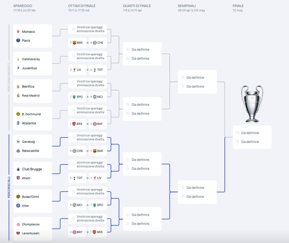 Per i nerazzurri si legge di un percorso potenzialmente facile. Possibile, altrettanto possibile che sia complicatissimo. Se supereranno il Bodo/Glimt, i ragazzi di Chivu sfideranno una tra Manchester City e Sporting CP Lisbona. Poi, una Bayern Monaco e Arsenal nell’eventuale quarto di finale. E in semifinale una tra: Qarabag, Chelsea, Newcastle, Barcellona, Club Brugge, Atletico Madrid, Tottenham, Liverpool. Per fare un esempio, il percorso City (ottavi), Bayern (quarti) e Barcellona (semifinale), sarebbe tutto fuorché in discesa. Lo stesso discorso, ovviamente, vale anche per Juventus e Atalanta. Parte destra o sinistra (o blu e rossa, usando i colori ufficiali UEFA) vogliono dire ancora troppo poco.
