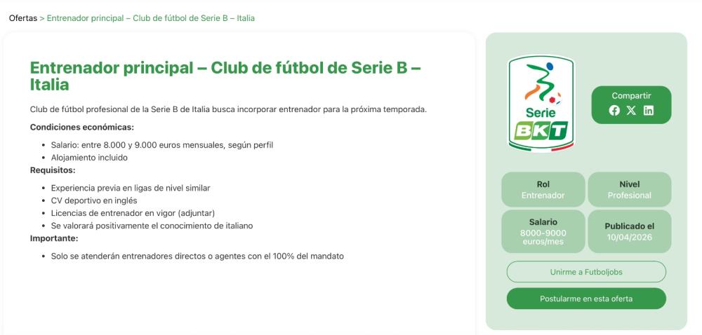Un club professionistico italiano di Serie B è alla ricerca di un allenatore principale per la prossima stagione e lo fa con un modo stranissimo per il calcio italiano. L'annuncio è pubblicato sulla piattaforma spagnola Futbol Jobs, offre condizioni economiche interessanti - tra gli 8.000 e i 9.000 euro mensili in base al profilo - e include anche l'alloggio. I requisiti richiesti sono l'esperienza in campionati di livello analogo, licenze UEFA regolari, curriculum sportivo in inglese.